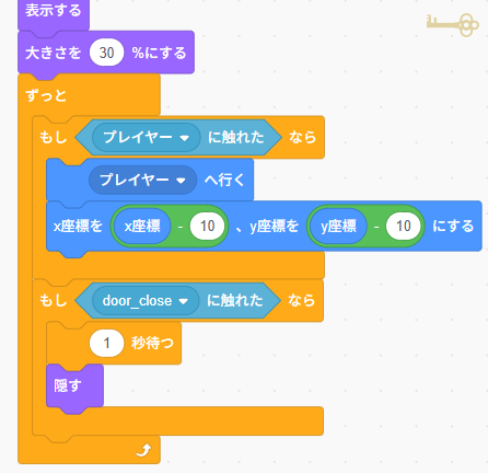 同じようなプログラムを「ずっと」と「もし」を使って作成するとこのようになりますが、2つのコードは、鍵を取った後の挙動に違いがでます。
