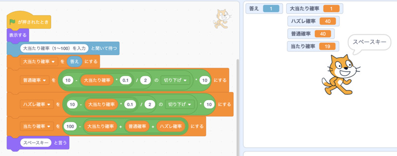 9.5を切り下げて40にしたいので、大当たり確率をに0.1を掛けて計算した後に10を掛けて戻すということをしています。