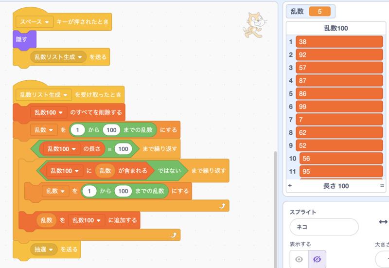 乱数100(リスト)に乱数(変数)が含まれるではないまで繰り返す、とすることで、重複しない数字が出るまで何度も乱数を生成し、最終的にリストに追加します。