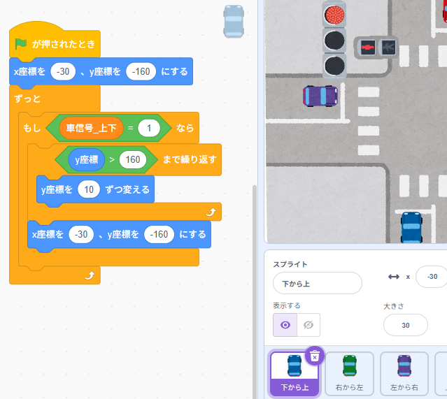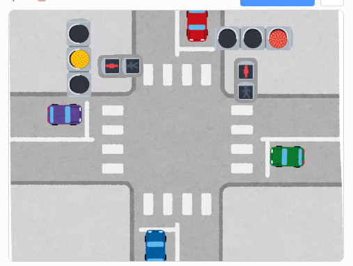 ここまでで、交差点を上下と左右の動きの車が信号に連動して直進するプログラムを作成出来ましたが、まだまだ物足りない感じがします。