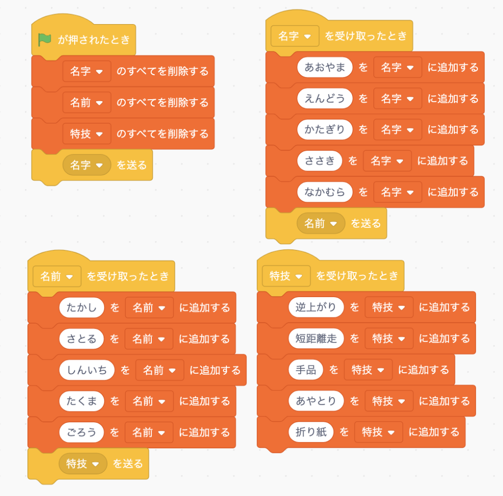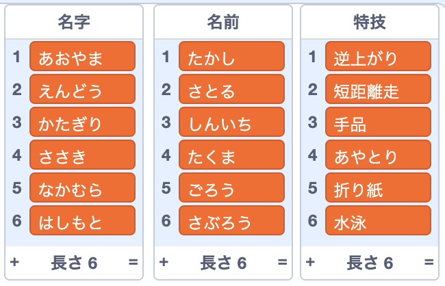 まずは、データの入った3種類のリスト(名字・名前・特技)を作りましょう。