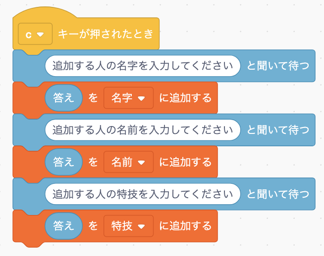今回の場合、名字、名前、特技のデータを新たに追加するということになるので、このようなコードになります。